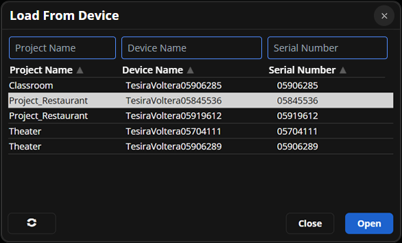Load from Device: A project file may be retrieved from a device and applied to a system. Select a device from the list to retrieve a project file from that device. Each device will appear on a separate line even if those devices share the same project file.