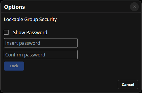 Options: Use to Lock, Unlock, or set a password for lockable groups. See the Password Protection section of Groups under the Design Phase for additional details.